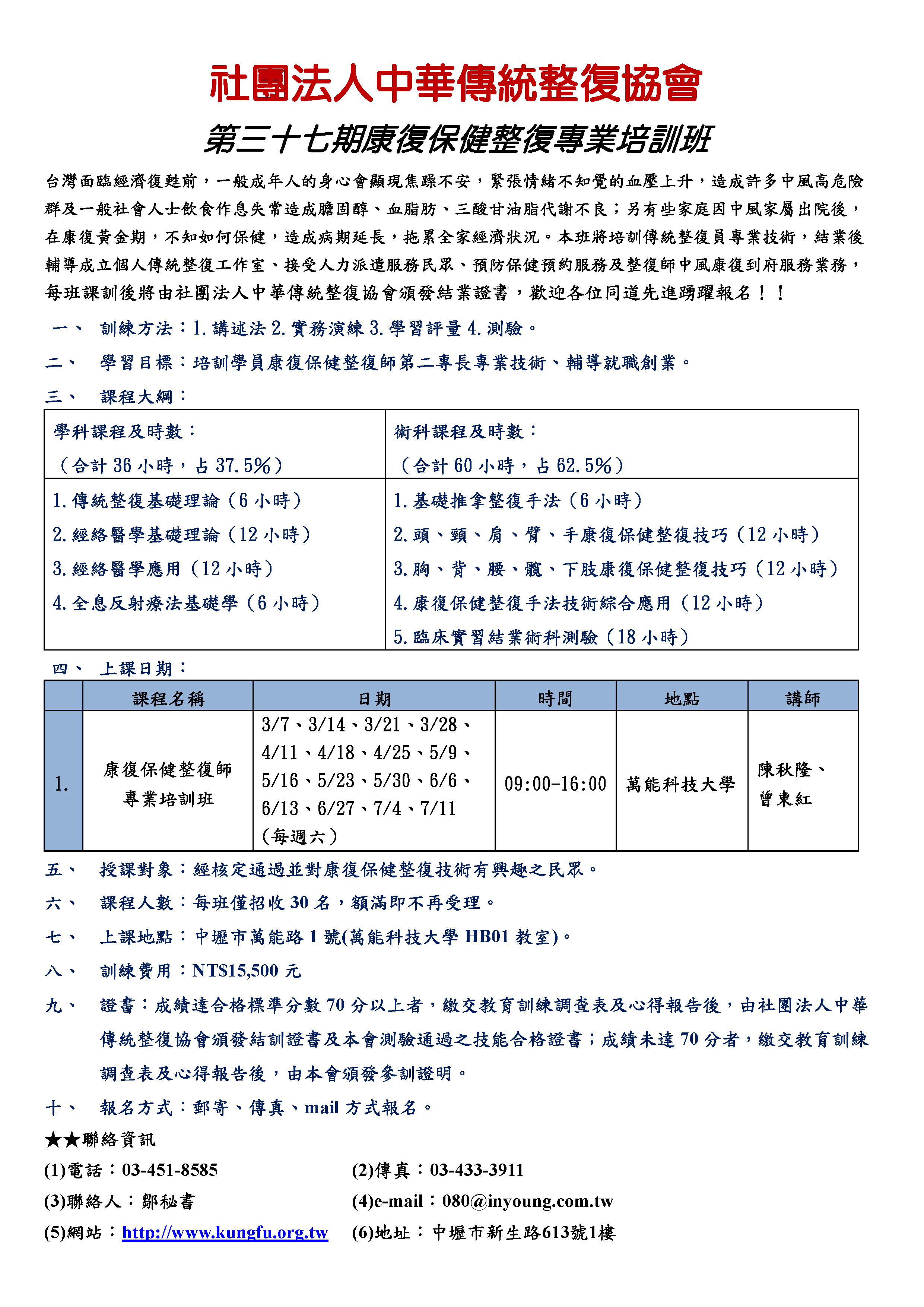 會址:台北市中正區博愛路25號2樓之9 電話:(02)2311-1899 FAX:(02)2311-1200 秘書處:桃園市中壢區新生路613號1樓 電話:(03)451-8585 FAX:(03)433-3911 網址:http://www.kungfu.org.tw Email:080@inyoung.com.tw |